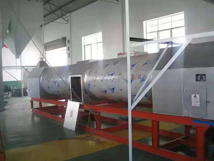 我們解決其技術問題所采用的技術方案是:一種新型環(huán)保節(jié)能熱風炒爐,由電源供電,包括第一燃燒室、第二燃燒室、熱風炒爐滾筒、存料機、自動喂料器、出料機、引風機和排潮風機,所述熱風炒爐滾筒的入口端通過自動喂料器與所述存料斗連通,所述熱風炒爐滾筒的入口端還通過風道與所述排潮風機連通,所述熱風炒爐滾筒的出口端與出料機連通,所述第一燃燒室和第二燃燒室通過風道與引風機連通,所述第一燃燒室和第二燃燒室分別位于所述熱風炒爐滾筒的下方,所述熱風炒爐滾筒軸心線與水平面形成2°到8°的夾角,所述第一燃燒器和第二燃燒器安裝位置在相應燃燒室的前端或者相應燃燒室的兩個側面。我們設備取消了原熱風炒爐所配套的單獨熱風爐、彎段風道或直段風道;在炒爐滾筒下方設計安裝兩份熱風燃燒室,用燃燒器產生的熱風直接對滾筒進行加熱,最大限度地縮減了炒爐散熱環(huán)節(jié)和面積,從而實現炒爐連段式加熱。與現有設備相比,我們公司設備充分利用了熱風釋放的熱量,減少了熱量損失,單噸油料或糧食加工消耗添人氣甚至能降低到25nm3,降低了17%,節(jié)能降耗效果非常明顯,得到了客戶的一致好評。與現有設備相比,同等日加工量,所配兩臺燃燒器合計功率比現有設備燃燒器功率下降20%-30%,熱風設定溫度有750-800℃下降到400-500℃,明顯延長了炒爐的使用壽命。第一燃燒室和第二燃燒室的功能各不相同,工作溫度也不一致,第一燃燒室和第二燃燒室能夠實現分段加熱溫度控制,更加靈活與合理,安全可靠,便于操作與控制。